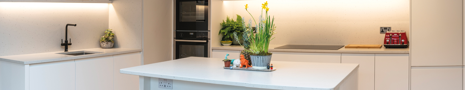 A handleless J-profile door in Matt White Caeserstone Frozen Terra worktops